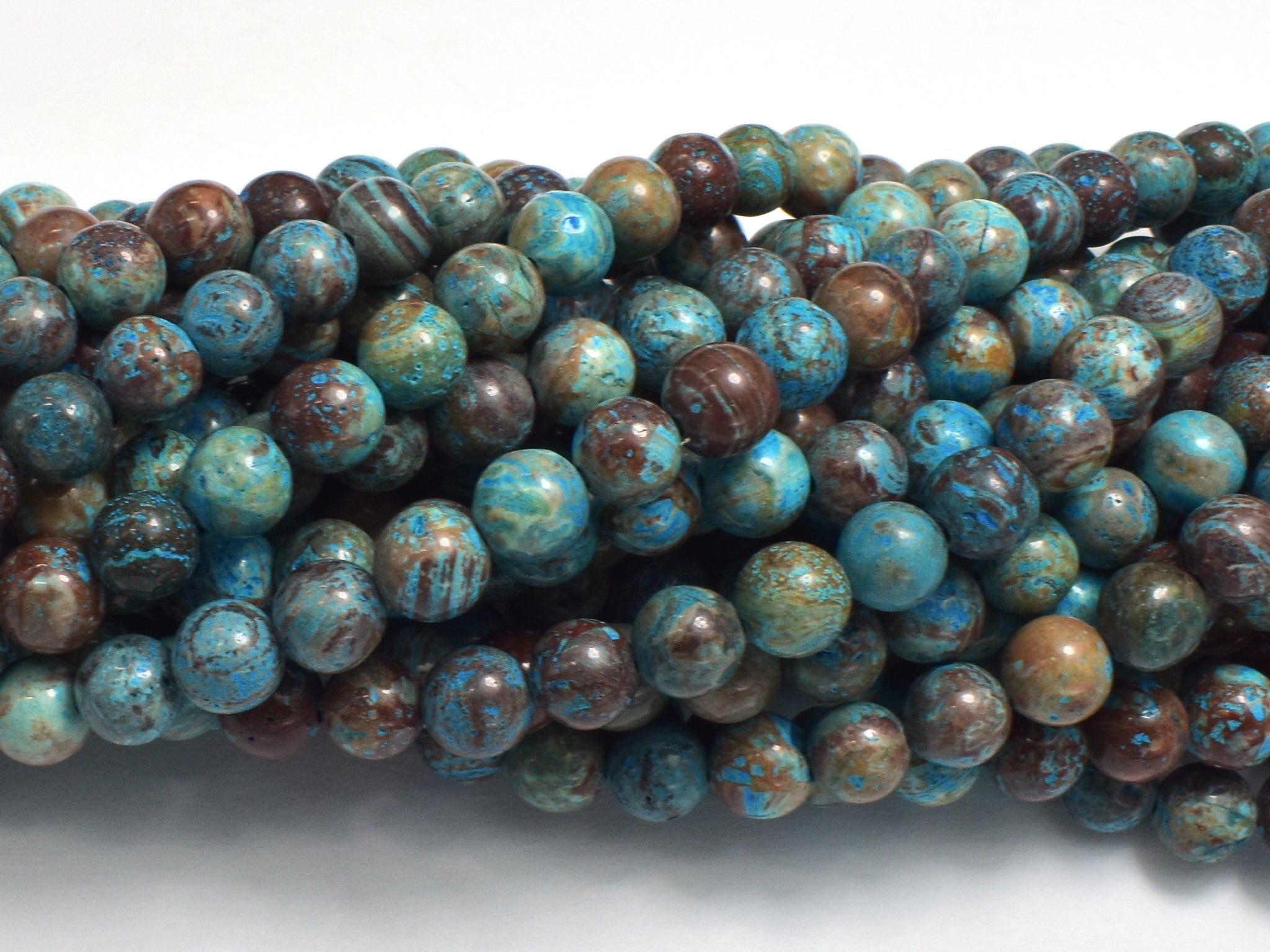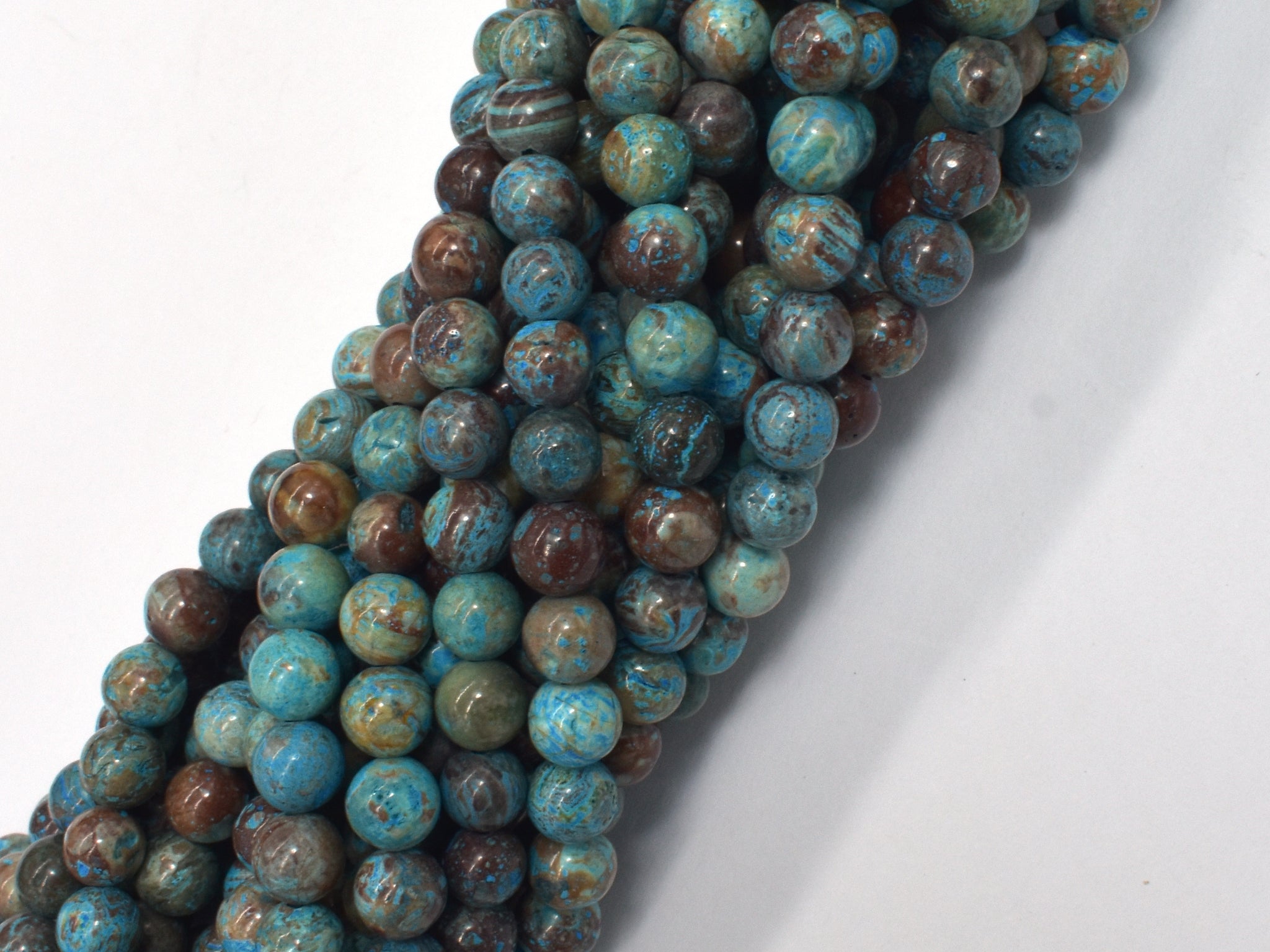 Name: Blue Calsilica Jasper Shape: Round Size: Approx. 6mm (6.3mm), 15 Inch, Full strand, Approx. 62 beads, Hole 1mm Color: Blue, Brown, Color enhanced Quality: AB+